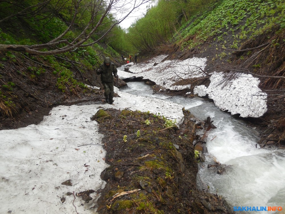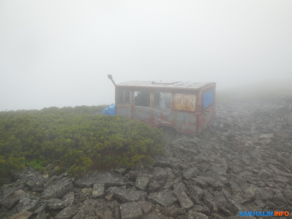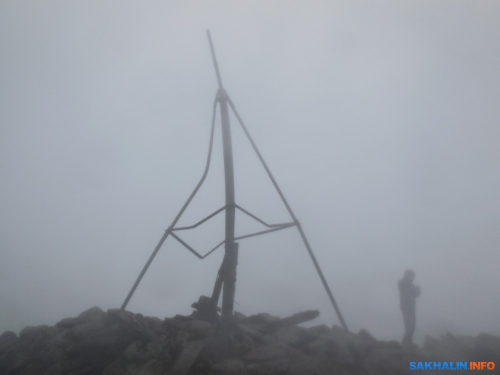 Всю дорогу нашу большую команду, в составе которой были и официальные лица, сопровождали дожди, туманы и вздувшиеся реки. Мы до последнего питали надежды, что хотя бы на вершине горы небо прояснится: так хотелось созерцать окрестности с такой высоты, в самом сердце острова, в глухой тайге (когда ещё такой шанс выпадет попасть в эти места!). Но нет, солнце дважды пыталось пробиться сквозь плотную пелену и окончательно умерло за серой хмарью. Мы вышли, пробиваясь с боями через стланик, на вершину Беловой, все мокрые от всё ещё лежащего снега и изматывающей мороси. Отогревались агрегатом Вани, да горячительным напитком из его изобильного рюкзака (в тех условиях этот напиток был как никогда необходим).
