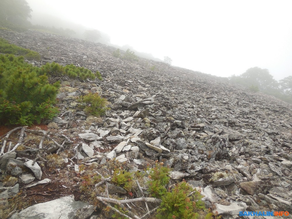 Одежда не долго оставалась сухой. Сквозь пелену безуспешно пытается пробиться солнце. Под ногами покрытые мхом живые камни — курумы. Это подвергшиеся воздействию ветра и воды россыпи древней лавы. Они и облегчают, и затрудняют движение. Нужно быть осторожным, чтобы не перевернуться, не поскользнуться. Камни так и норовят прийти в движение под ногами. В разбросанных по склону рощах щебечут птицы. Длинные снежные языки прячутся в тумане.